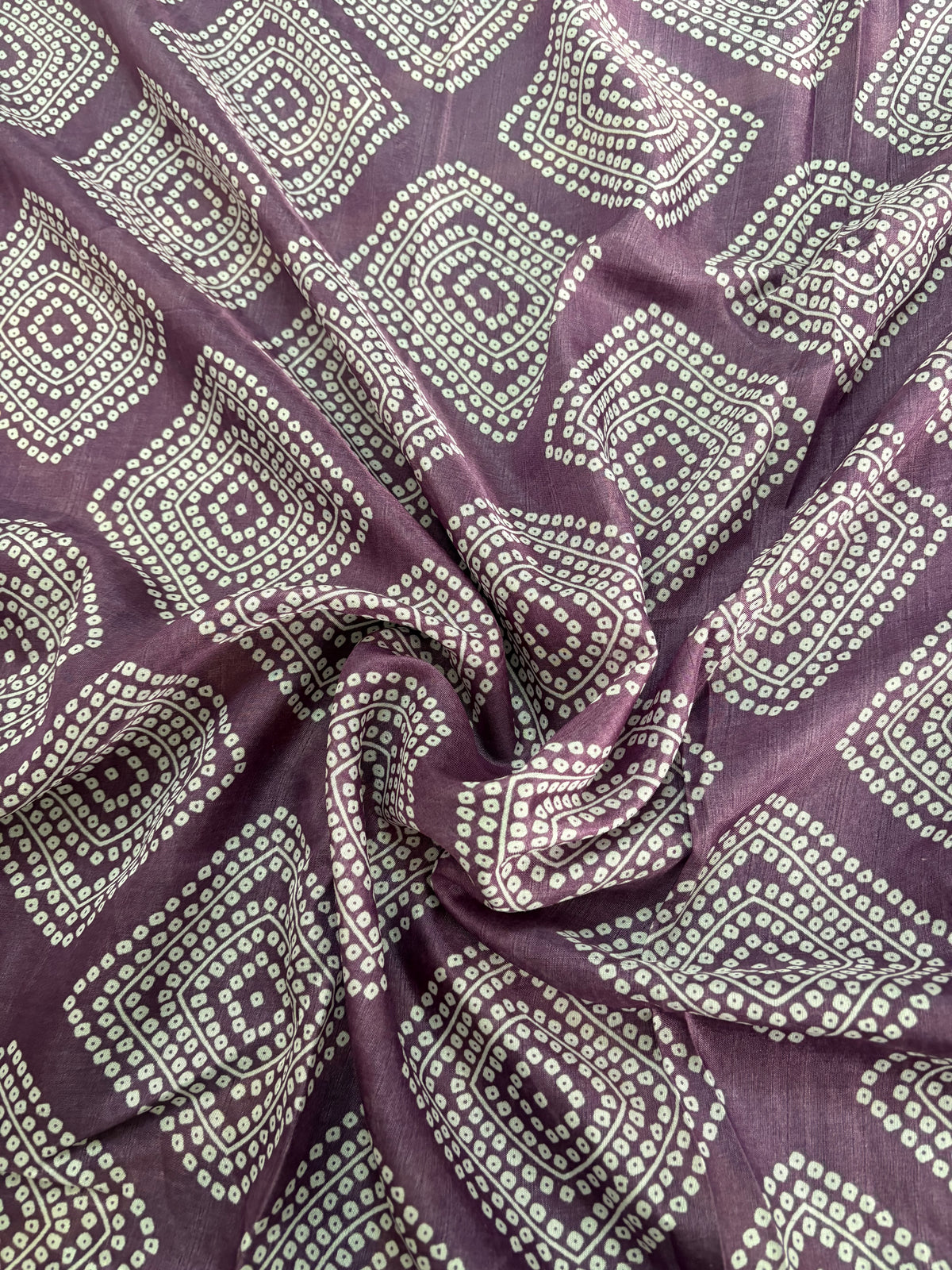 Unveil artisanal heritage in this violet bandhani dola silk saree, hand-tied with classic white diamond bandhani dots on rich violet for mesmerizing texture. Premium dola silk infuses lustrous flow, featherlight grace, and enduring sophistication. Captivating for cultural fests, evening melas, art events, or statement-making occasions.