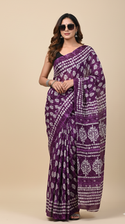 Step into delicate grace with the Lavender Dream Saree, crafted from pure cotton mulmul in a regal purple shade accented by crisp white prints. The soft and breathable fabric promises unmatched comfort, making it an ideal choice for warm weather and extended wear. This saree's intricate patterns evoke a sense of timeless beauty, perfect for festive occasions, casual gatherings, or a graceful everyday look.