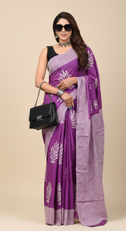 Elevate your collection with the Lavender Drift Saree by EasyPysy—a perfect fusion of contemporary style and classic comfort. Crafted from soft cotton in a stunning lavender shade, this saree is adorned with chic white botanical motifs and modern striped accents. Its lightweight feel and elegant vibe make it an effortless choice for office wear, casual outings, or festive gatherings.