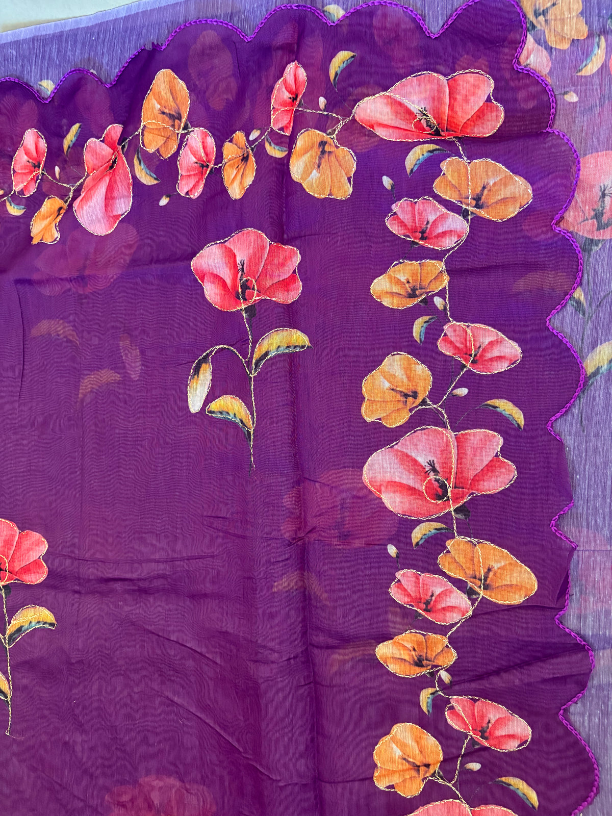 Embrace vibrant elegance with this purple floral print dola silk saree, featuring cascading pink and orange poppy blooms on a sheer purple base. Crafted from lightweight, smooth dola silk for a fluid drape and breathable comfort, it drapes beautifully for all-day wear. The scalloped edges and delicate floral motifs add a touch of artistic charm, making it perfect for casual outings, office wear, small gatherings, and everyday ethnic looks.